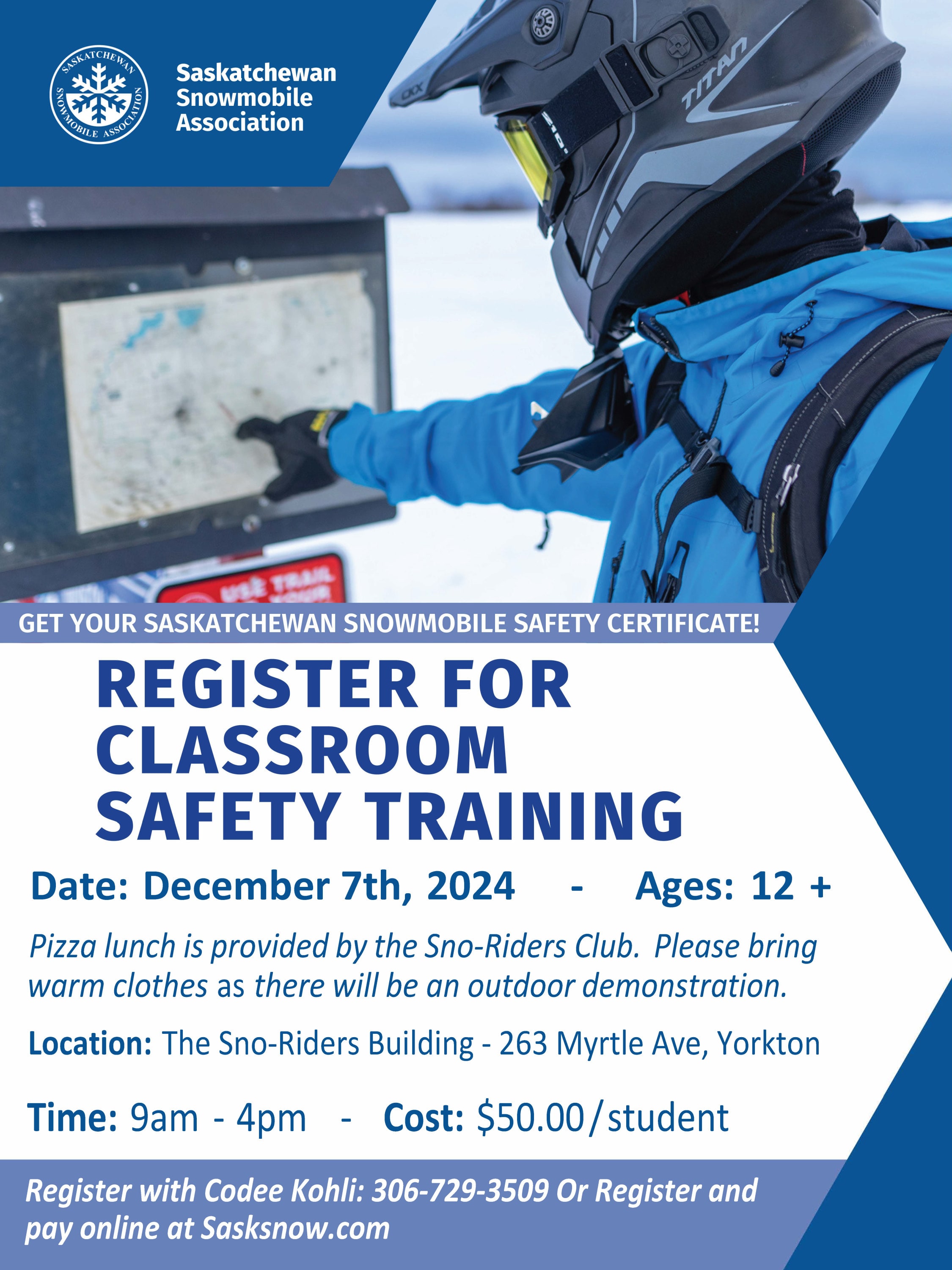 The Yorkton Sno-Riders are pleased to be hosting a snowmobile safety course on Saturday December 7th in Yorkton at 263 Myrtle Ave. The course starts at 9:00 am - 4:00 pm. Pizza lunch will be provided by the Club. Snacks and juice/water will also be provided. There will be a static demonstration on a snowmobile so please bring warm clothing for some time spent outdoors. The cost of the classroom safety course is $50.00 per student and includes all course materials. All students attending will receive some promotional items from Saskatchewan Snowmobile Association.