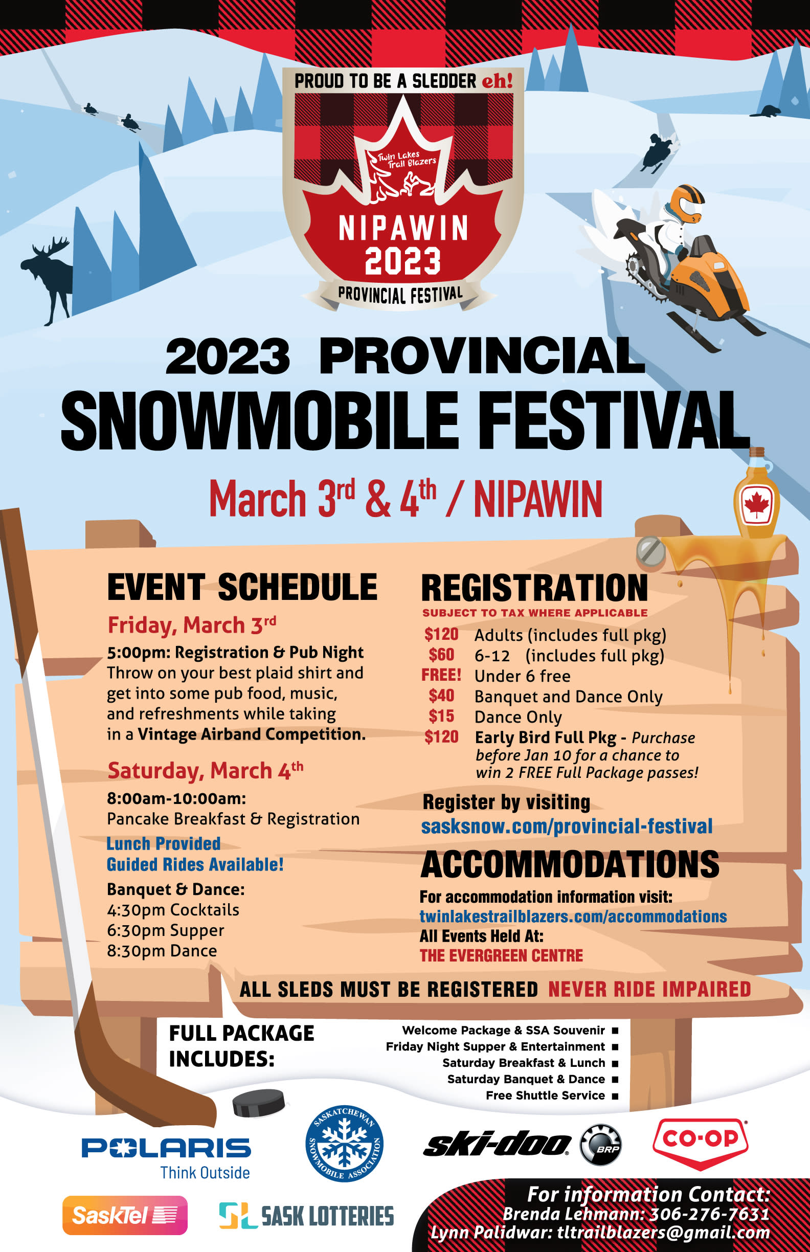 The Provincial Snowmobile Festival is back, March 3rd-4th in Nipawin! Everything kicks off Friday March 3rd with registration and a vintage pub night and air band competition. Saturday starts with a pancake breakfast followed by a day of riding, with optional guided rides available! Following a full day of riding everyone will meet back at the Evergreen Centre for the banquet and dance.