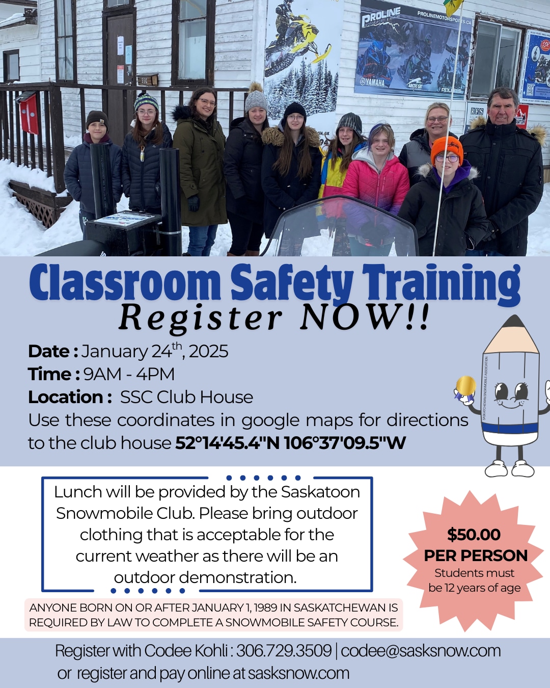 The Saskatoon Snowmobile Club is hosting a Snowmobile Safety Course on January 24th, 2026! The course will be instructed by Jerry Jemieff! The course runs from 9AM-4PM and is located at the Saskatoon Snowmobile Club House. For directions to the club house please enter these coordinates into google maps 52°14'45.4'N 106°37'09.5'W . The Saskatoon Snowmobile club is generously providing lunch for all attendees! There will also be juice/pop and snacks provided for the students to enjoy throughout the day. There will be a static demonstration on a snowmobile so please bring warm clothing for some time spent outdoors.