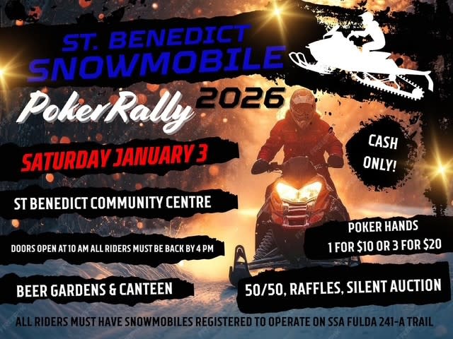 Saturday January 3rd, 2026 All riders must register to operate on SSA Fulda 241-A Trail Location : St. Benedict Community Centre Doors open at 10AM - All riders must be back by 4PM Poker Hands - 1 for $10 or 3 for $20 CASH ONLY Beer gardens and canteen! For More information and updates check our Facebook page below: https://www.facebook.com/groups/193406332390616/Additional Info